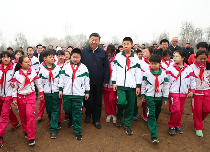 4月2日,党和国家领导人习近平、李克强、栗战书、汪洋、王沪宁、赵乐际、韩正、王岐山等来到北京市通州区张家湾镇参加首都义务植树活动。这是植树活动结束时习近平同少先队员在一起。