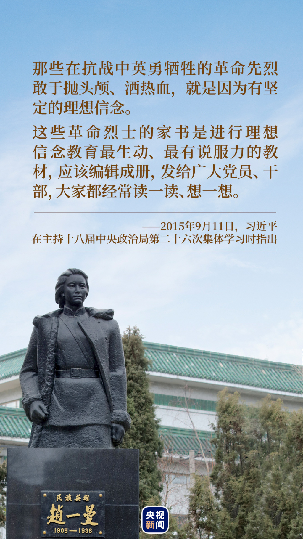 “赵一曼在临死前的遗书中写道:‘母亲因为坚决地做了反满抗日的斗争,今天已经到了牺牲的前夕了。母亲和你在生前是永久没有再见的机会了……我最亲爱的孩子啊!母亲不用千言万语来教育你,就用实行来教育你。在你长大成人之后,希望你不要忘记你的母亲是为国而牺牲的……母亲死后,我的孩子要代替母亲继续斗争,自己壮大成长,来安慰九泉之下的母亲!’”一字一句,总书记饱含深情。