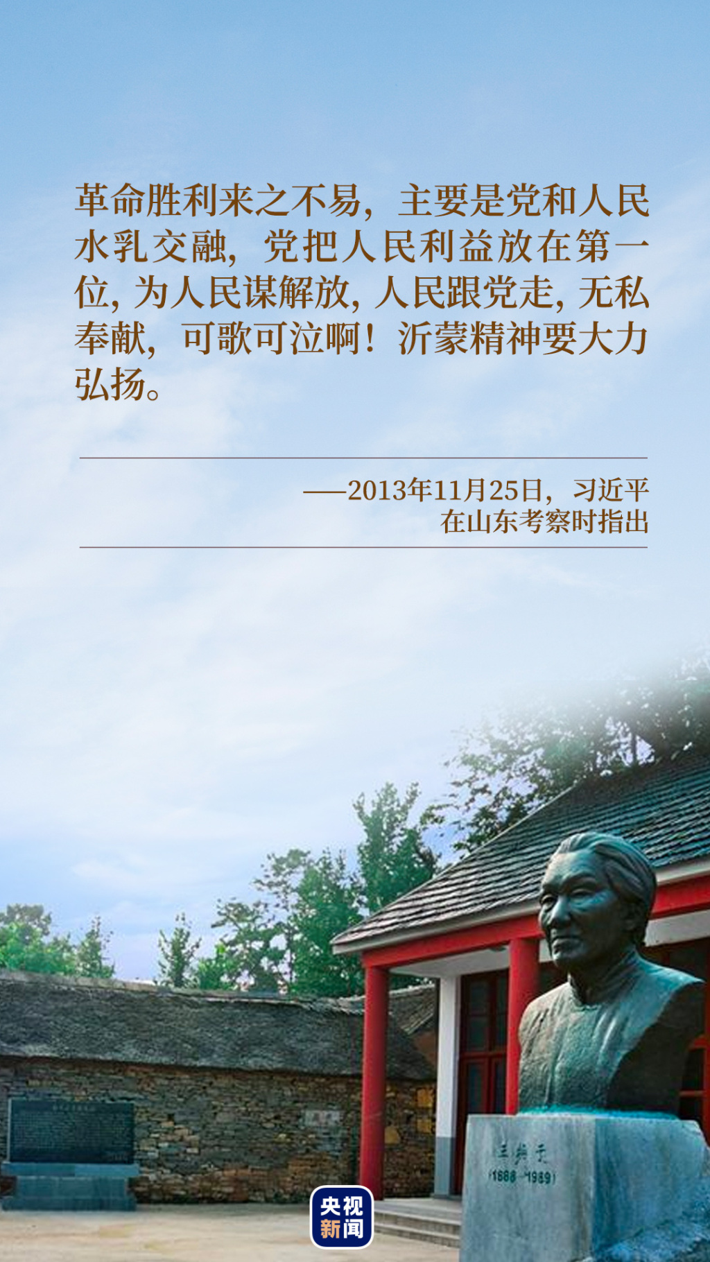 “在沂蒙这片红色土地上,诞生了无数可歌可泣的英雄儿女,沂蒙六姐妹、沂蒙母亲、沂蒙红嫂的事迹十分感人。”习近平总书记深情地说。2013年11月25日,习近平在视察山东沂蒙革命老区临沂期间,专程前往华东革命烈士陵园,向革命烈士纪念塔敬献花篮并参观沂蒙精神展。