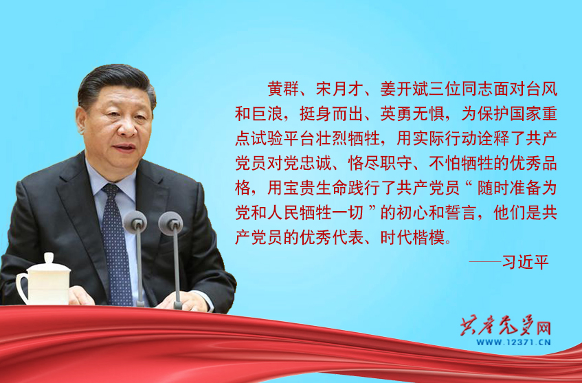 习近平闻讯后对黄群等三位同志壮烈牺牲作出重要指示指出,黄群、宋月才、姜开斌三位同志面对台风和巨浪,挺身而出、英勇无惧,为保护国家重点试验平台壮烈牺牲,用实际行动诠释了共产党员对党忠诚、恪尽职守、不怕牺牲的优秀品格,用宝贵生命践行了共产党员“随时准备为党和人民牺牲一切”的初心和誓言,他们是共产党员的优秀代表、时代楷模。习近平强调,广大党员干部要以黄群、宋月才、姜开斌同志为榜样,坚定理想信念,不忘初心、牢记使命,履职尽责、许党报国,为实现“两个一百年”奋斗目标、实现中华民族伟大复兴的中国梦贡献智慧和力量。